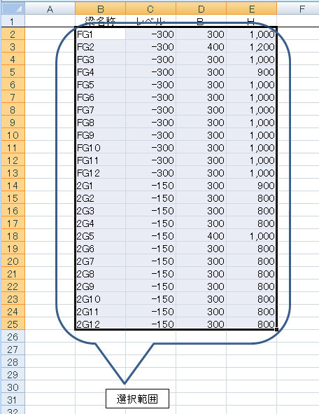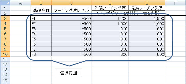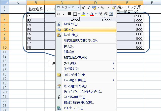 | 作図したい基礎の一覧を上図のように選択し、コピーします。 |