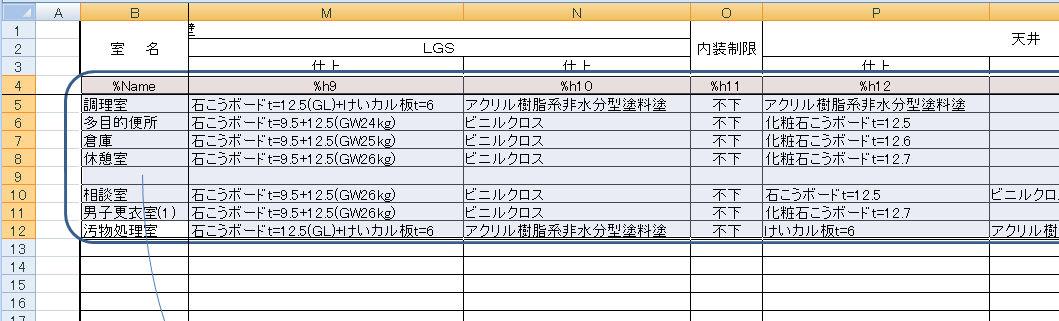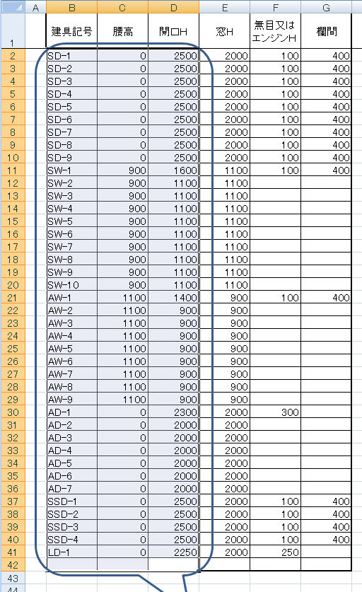 | 作図したい建具の一覧を上図のように選択し、コピーします。 |