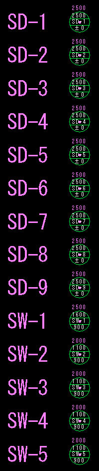 施工図記号をつくるときにどのように作成されてますか?。以前に作図した図面を開いて、複写しそれを編集して作るなど方法は人それぞれです。基礎記号、梁記号、スラブ記号はまだ数が少ないほうですが、建具符号、仕上げ表となると結構あるものです。 |
