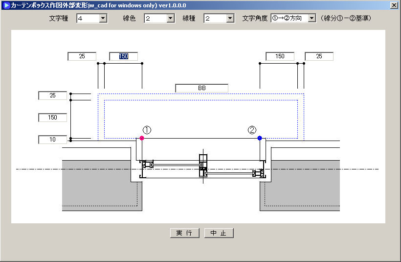 ダウンロードした【Curtain_box.lzh】を解凍します。【Curtain_box.bat】、【Curtain_box.exe】、【Curtain_box説明.txt】 、【Curtain_box.dat】のファイルが出来ます。これらのファイルを、任意のフォルダ(名前の中に空白を含まない)に移動します。jwwを起動し、「外部変形」で【Curtain_box.bat】を指定します。メッセージに従い、指示します。 |