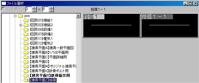 ダウンロードした【Jw_opt1_2.lzh】を解凍します。【JW_OPT1_2.DAT】、【括弧説明.TXT】のファイルが出来ます。【JW_OPT1_2.DAT】の「_2」の部分を適当なアルファベットに変えます(例:JW_OPT1Z.dat)。名前を変更したファイルを\jww以下のフォルダに移動します。あとは、jwwを起動し、「建平」を選択し、「建具平面Z」を選択すれば、下記の画面のようになります。 |