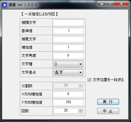 連番を作図するアプリです。基点を指示して作図するものと、2点を指示しその間を何分割するかで作図するものがあります。 |
