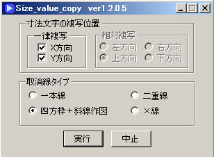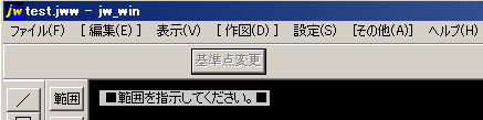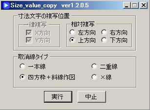 ダウンロードした【Size_value_copy.lzh】を解凍します。【Size_value_copy.bat】、【Size_value_copy.exe】、【Size_value_copy説明.txt】 他のファイルが出来ます。これらのファイルを、任意のフォルダ(名前の中に空白を含まない)に移動します。jwwを起動し、「外部変形」で【Size_value_copy.bat】を指定します。メッセージに従い、指示します。 |