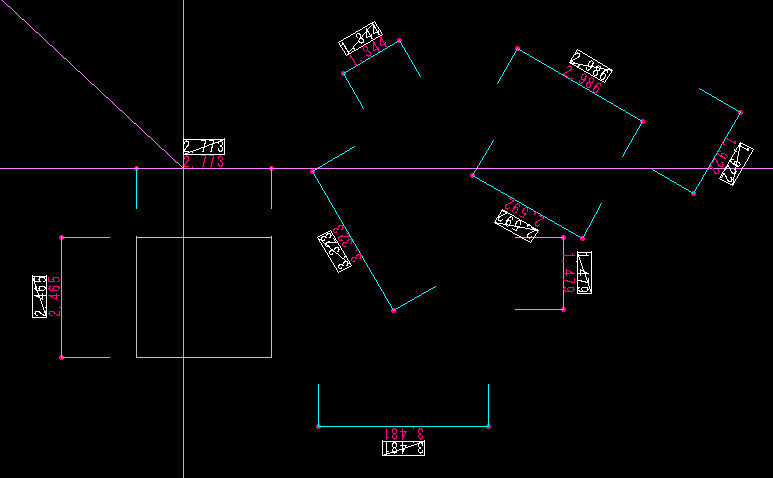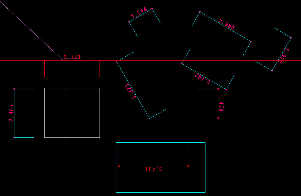 一度に複数の寸法図形値を選択することは出来ますが、基準点から指示点への複写が基本動作であるため、傾きを持った寸法図形が複数混在した場合は注意が必要です。 |