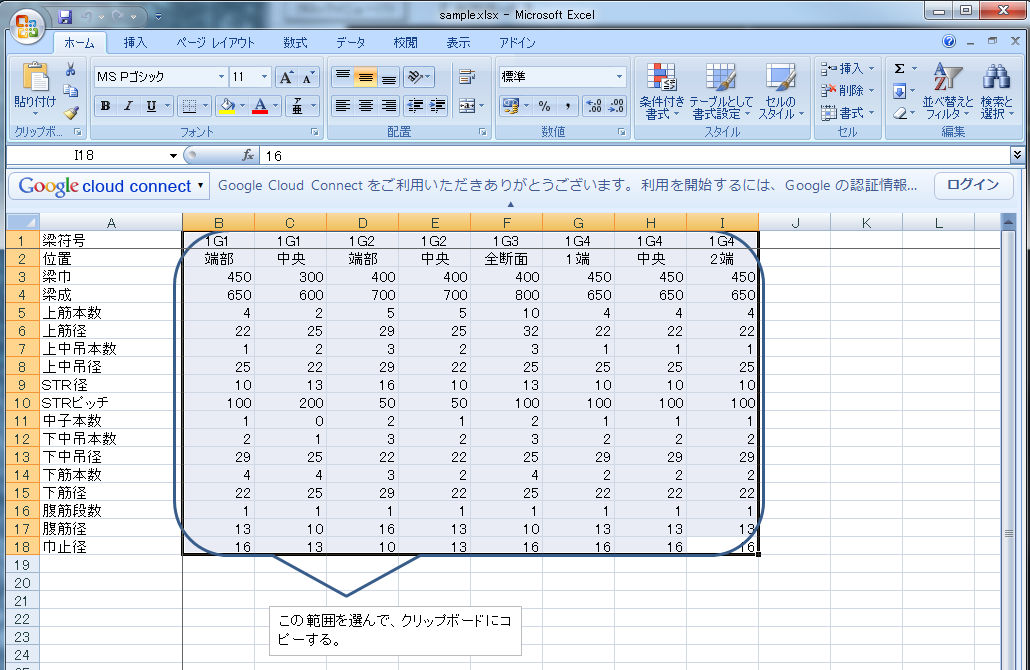 | sample.xlsxを参考に梁筋一覧を作成しておきます。 |