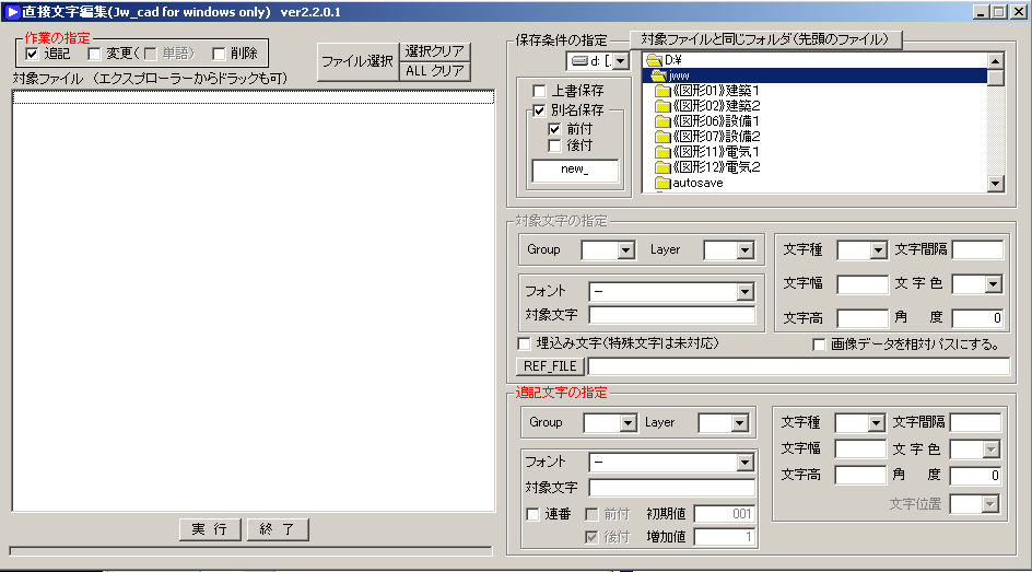 ファイルの読込み、書込みが失敗した場合は、失敗したファイル一覧を表示しますので、jwwで開いて編集を行ってください。 |