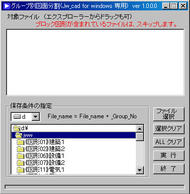 ファイルネームは、【元のファイルネーム+「_」+グループ番号.jww】です。変更は出来ません。 |
