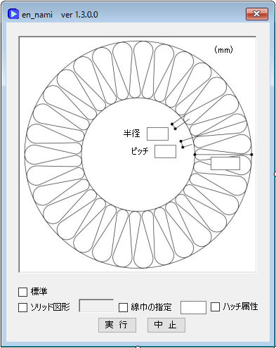 ダウンロードした【en_nami.lzh】を解凍します。【en_nami.bat】、【en_nami.exe】、【en_nami説明.txt】のファイルが出来ます。これらのファイルを、任意のフォルダ(名前の中に空白を含まない)に移動します。jwwを起動し、「外部変形」で【zline.bat】を指定します。メッセージに 従い、内側基準円を指示します。【en_nami.exe】に処理が移り、下記の画面になります。 |