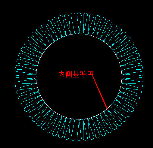 本ソフトは、円周長さ/弧長の端数を切上げた回数で、均等に割付を行います。 |