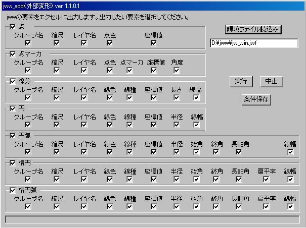 条件を保存すると、jww_add.datというファイルが作成されます。このファイルは、むやみに改変しないでください。起動時に自動的に読込みを行いますので、正常に起動しなくなったら、このファイルを削除して再実行してください。 |