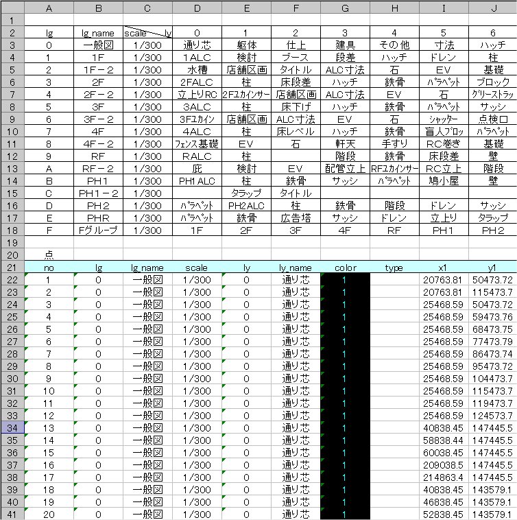 エクセルのバージョンによっては、「数値が文字列で保存されています」というエラー表記になりますが、あえて文字列で出力しています。縮尺を数値で「1/20」とするとエクセル側で「1月20日」という表示になることがあるので、これを防いでいます。 |