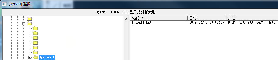 ダウンロードした【lgswall.lzh】を解凍します。【lgswall.bat】、【lgswall.dat】、【lgswall.exe】 、【lgswall.dat】、【lgsdata】(フォルダ)のファイルが出来ます。これらのファイルを、任意のフォルダ(名前の中に空白を含まない)に移動します。 |