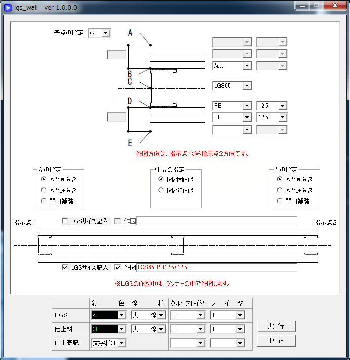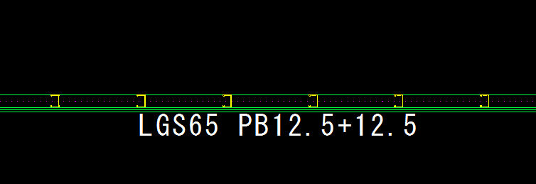 軽量壁のLGS、仕上、開口補強、断熱材表記を作図します。仕上のボードが二重張り、シングル張りでLGSピッチを変えて作図を行います。三重張りまでには対応しましたが、これより厚い場合は自分で作図してください。 |