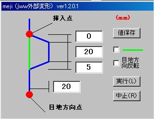 ダウンロードした【meji.lzh】を解凍します。【meji.bat】、【meji.exe】、【meji説明.txt】のファイルが出来ます。これらのファイルを、任意のフォルダ(名前の中に空白を含まない)に移動します。jwwを起動し、「外部変形」で【meji.bat】を指定します。メッセージに従い、指示します。【meji.exe】に処理が移り、下記の画面になります。 |