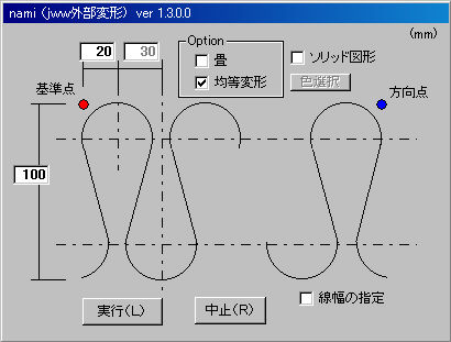 ダウンロードした【nami.lzh】を解凍します。【nami.bat】、【nami.exe】、【nami説明.txt】のファイルが出来ます。これらのファイルを、任意のフォルダ(名前の中に空白を含まない)に移動します。jwwを起動し、「外部変形」で【nami.bat】を指定します。メッセージに従い、始点と終点を指示します。【nami.exe】に処理が移り、下記の画面になります。 |