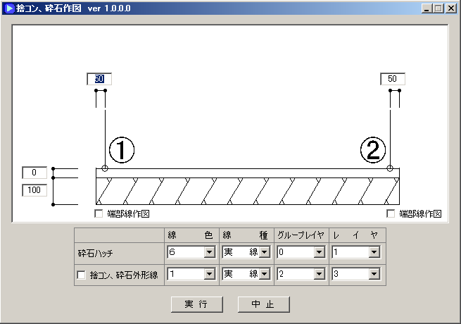 上記の画面で指定して実行します。 この例では、捨コンは作図しないで砕石のみの指定をしているところです。 |