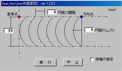 ダウンロードした【seal_line.lzh】を解凍します。【seal_line.bat】、【seal_line.exe】、【seal_line説明.txt】のファイルが出来ます。これらのファイルを、任意のフォルダ(名前の中に空白を含まない)に移動します。jwwを起動し、外部変形で【seal_line.bat】を指定します。 メッセージに従い、始点と終点を指示します。【seal_line.exe】に処理が移り、下記の画面になります。 |
