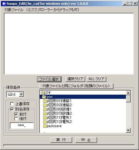 jww(ver3.51以降のデータ構造)のファイルを対象にしています。DOS版のjwcファイルは、出来ません。 |
