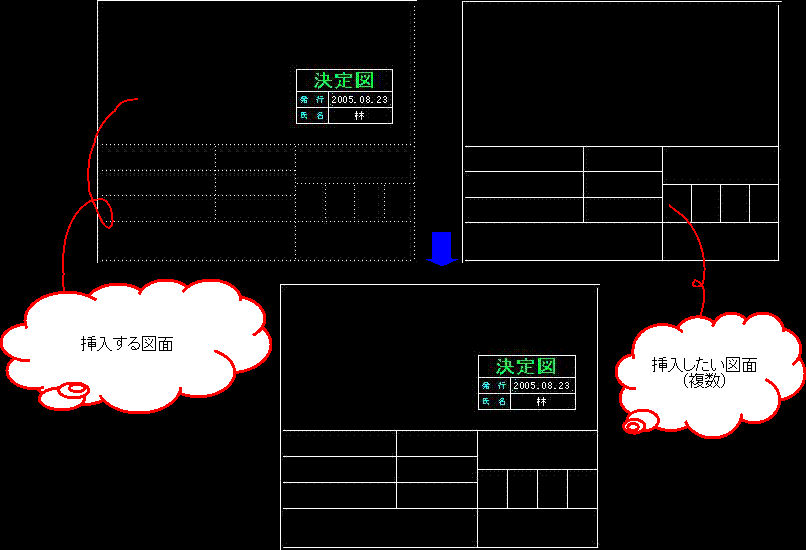 一つの使い方として、完成した複数の図面があります。新たに、完成用の枠付の情報だけを記した図面を作成します。この時点で、合成したときの状況を考慮し、グループ、レイヤを決め正確に作図を行います。このときの縮尺は、あまり重要では有りません。